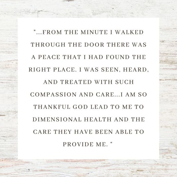 Here at Dimensional Health, we address the underlying causes of disease by shifting the traditional disease-centered focus of medical practice to a more patient-centered approach. We address the whole person, not just an isolated set of symptoms. The focus is on optimal functioning of the body and its organs so that the body is able to heal itself.